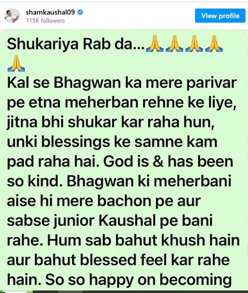 इस खास मौके पर विक्की के पिता और फिल्म इंडस्ट्री के वरिष्ठ एक्शन डायरेक्टर *शाम कौशल* ने भी अपनी खुशी जाहिर की। उन्होंने इंस्टाग्राम पर एक भावुक पोस्ट साझा करते हुए लिखा, “रब दा शुक्रिया… कल से भगवान का मेरे परिवार पर इतना मेहरबान रहने के लिए जितना भी शुक्रिया अदा करूं, कम है। भगवान बहुत दयालु हैं। उनकी मेहरबानी ऐसे ही मेरे बच्चों और सबसे जूनियर कौशल पर बनी रहे। शाम कौशल ने आगे लिखा कि परिवार में नए सदस्य के आने से सभी बेहद खुश और आभारी महसूस कर रहे हैं। उन्होंने कहा, “हम सब बहुत खुश हैं और खुद को बहुत ब्लेस्ड महसूस कर रहे हैं। दादा बनने पर शब्द नहीं हैं। भगवान की कृपा सभी पर बनी रहे। रब राखा।”