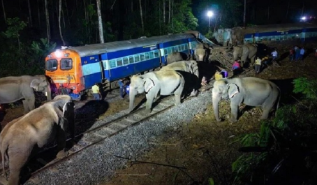 होजाई (असम): असम के होजाई जिले में शुक्रवार देर रात बड़ा रेल हादसा हो गया। सायरंग–नई दिल्ली राजधानी एक्सप्रेस हाथियों के एक झुंड से टकरा गई, जिससे आठ हाथियों की मौत हो गई जबकि एक हाथी घायल हो गया। हादसे में ट्रेन का इंजन समेत पांच डिब्बे पटरी से उतर गए। रेलवे के अनुसार, इस घटना में किसी भी यात्री के घायल होने की सूचना नहीं है।