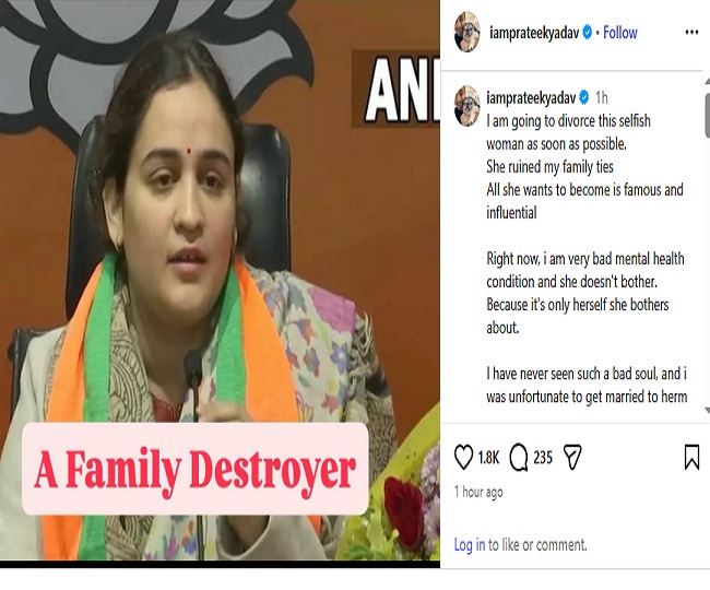 प्रतीक यादव ने अपर्णा यादव से अलग होने का किया ऐलान, इंस्टाग्राम पोस्ट में पत्नी को बताया स्वार्थी