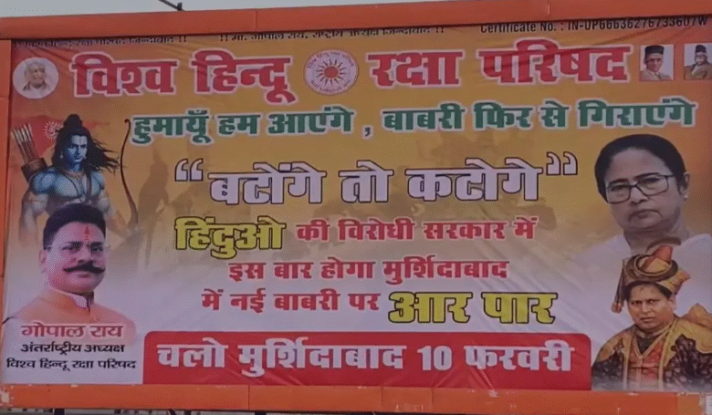 मुर्शिदाबाद में बन रही एक नई मस्जिद के निर्माण के विरोध में उत्तर प्रदेश की राजधानी लखनऊ के कई चौराहों पर पोस्टर लगाए गए हैं। इन पोस्टरों में 10 फरवरी को मुर्शिदाबाद कूच का आह्वान किया गया है। यह पोस्टर विश्व हिंदू रक्षा परिषद की ओर से लगाए जाने का दावा किया गया है।