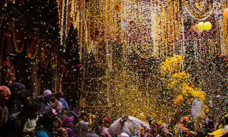 वृंदावन के मंदिरों में फूलों की वर्षा के बीच भक्त होली मनाते हैं। यह दृश्य आध्यात्मिक और मनमोहक होता है।